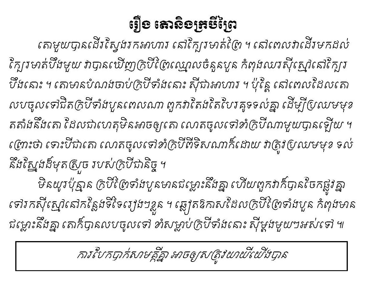 During our stay in Kompong Cham City, between 1970-1975, Sama had an opportunity to spend some time on a farm belonging to our aunt, Om Ly, in Chamkar Leur where he had been exposed to farm animals. So he gave me some pointers on how to handle farm animals while we were watching the oxen graze. The day went by rather uneventfully. When the day drew to a close, we took the oxen to a lake near our house to wash them. Afterward, we brought them back to the barn. We told the owner how easy-going and obedient the two oxen were. The man nodded his head approvingly.